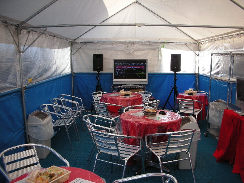 サーキットという特異な性質上、天候やスペースの有効活用、また時間効率など状況に合わせた的確な対応力が必要とされます。いつでも、どんな天候でも、どなたにでも寛いで過ごして頂ける「居心地の良い空間」をご提供いたします。 弊社では、ホスピタリティエリアに必要なテントや空調、映像機材、備品什器に至るまで自社保有し、運搬~設営そして開催中のケータリングサービスまでトータルにサポートいたします。